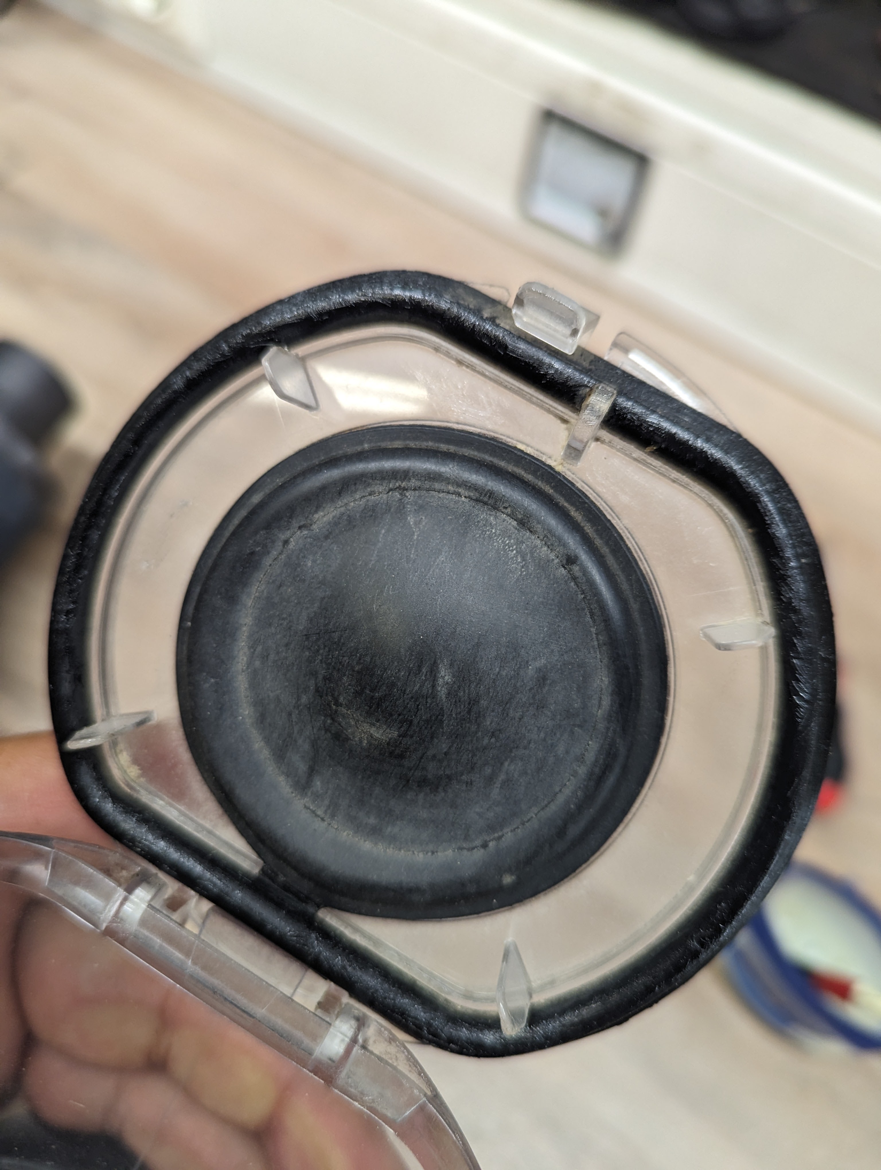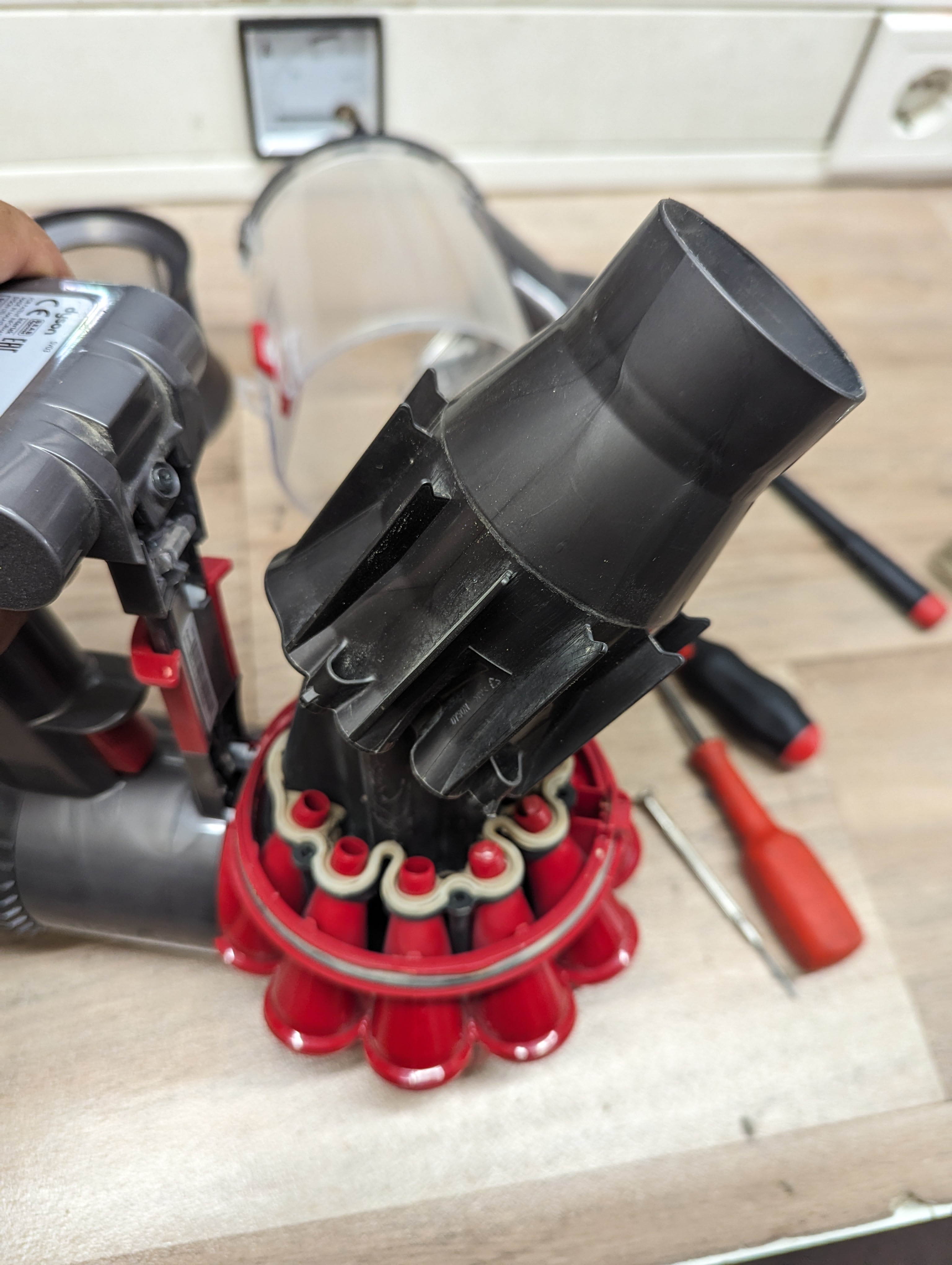 Beim rotem Teil werden Löcher sichtbar. Diese am Besten draußen mit Kompressor ausblasen. Wenn keiner Verfügbar zärtlich ausklopfen. Hier ist sehr viel Staub der die Düsen verstopft. Reinigen sie bitte mit einem Pinsel die helle Dichtung. Diese mit Vaseline oder Silikonfett danach einfetten.