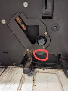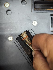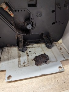 Die beiden unteren kleineren Schrauben aufdrehen und die Abdeckung abnehmen. Na da sehen wir nun die Ursache.