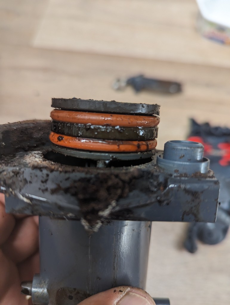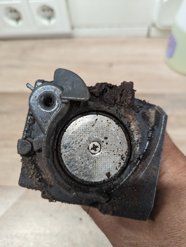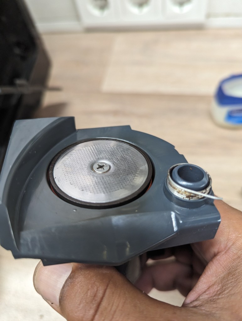 Von unten schieben Sie das Teil hoch bis die Dichtungen rauskommen. Danach komplett rausziehen aus der Kammer. Dichtungen abziehen und entsorgen. Rest ordentlich reinigen. Das Siebchen lassen wir.