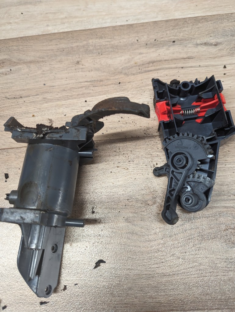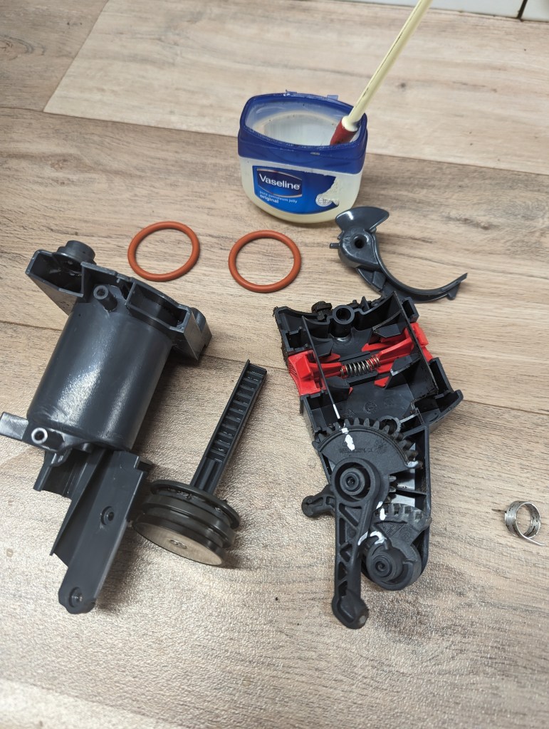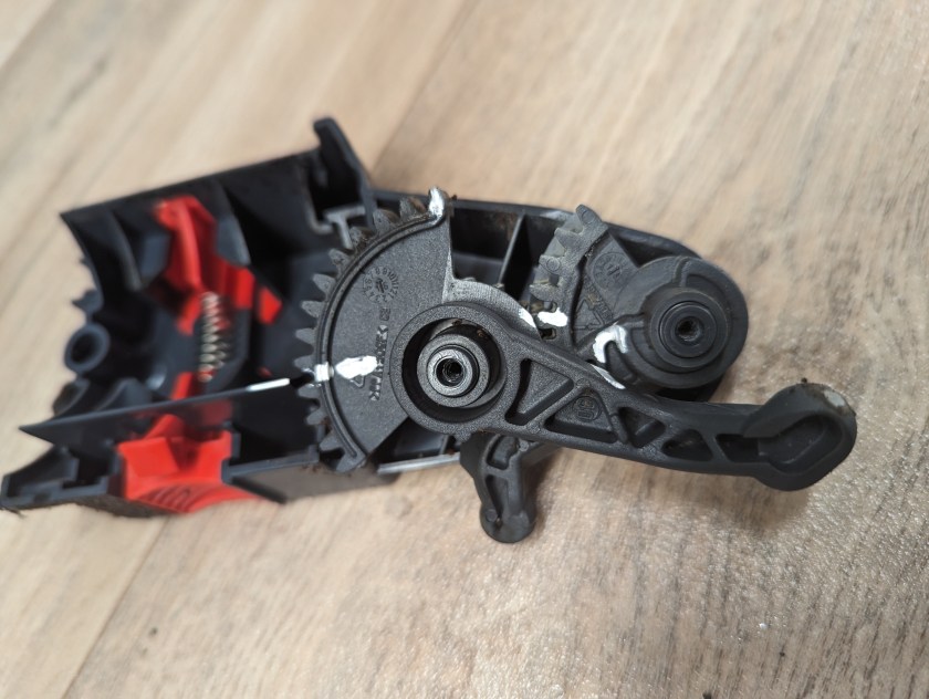 VORSICHT beim auseinander nehmen. Passen Sie auf, das die beiden Zahnräder nicht herausfallen. Denn als Laie bekommt man diese schwer in die richtige Position. Da wird es sehr nervend. Keine Sorge sollte es dennoch passiert sein, weiter unten beim zusammen setzen zeige ich ein Bild wie es sein sollte. Hier würde man sich viel Zeit ersparen.