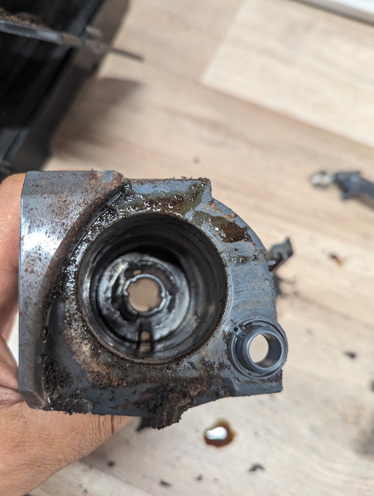 Das Teil mit den Dichtungen wieder rein in die Kammer. Das größere Loch ist Verständlich. In das kleinere Loch muss die kleine Spitze rein, dieses sehen Sie weiter oben im Bild mit den neuen Dichtungen.