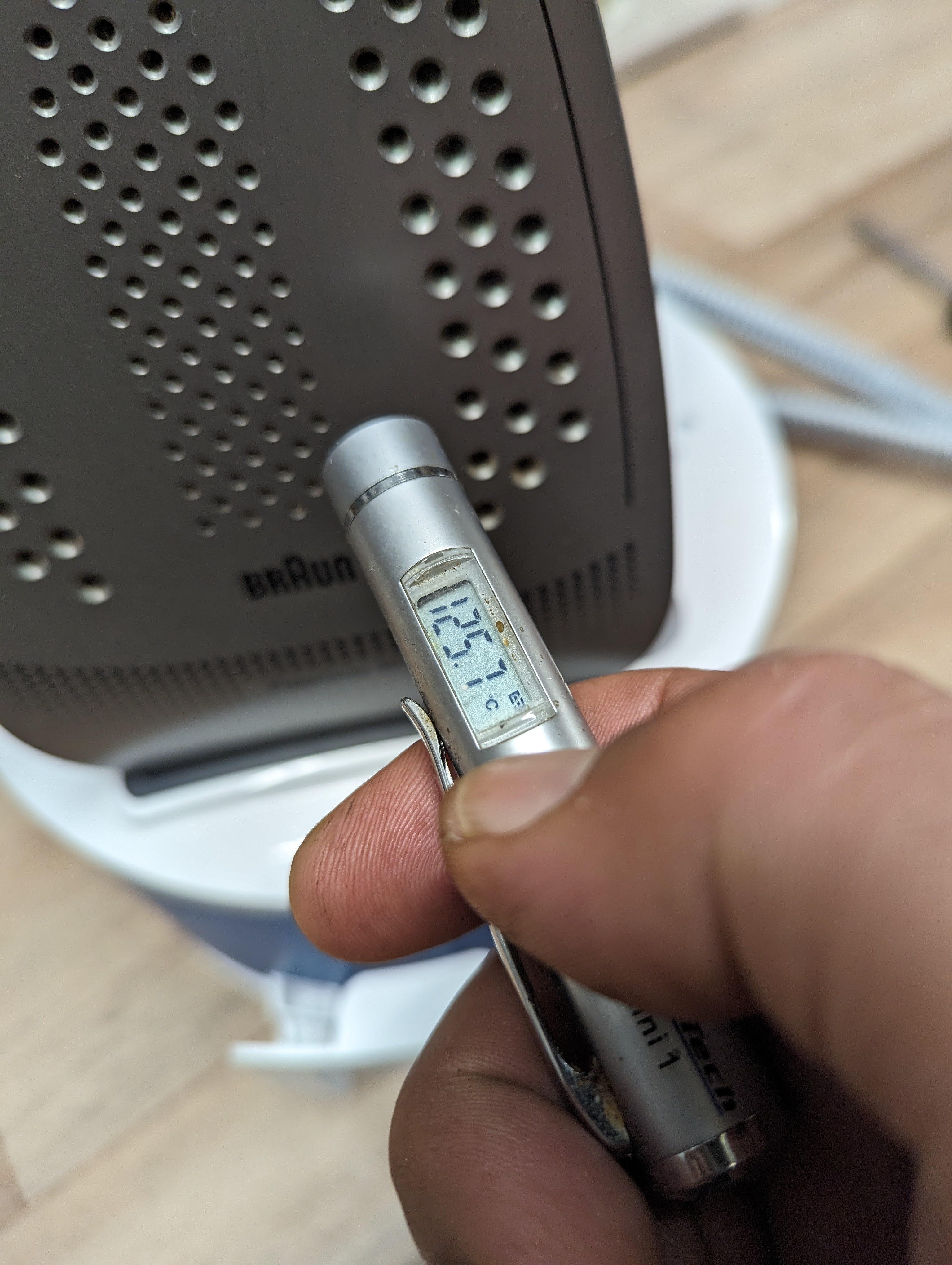 Eine intakte Bügelsohle sollte auf der höchsten Stufe ca. 220° erreichen. Ich habe so ein kleines Messgerät, gestehe keine Ahnung woher, aber es erfüllt meine Anforderungen. Auch wenn es eine Differenz von 5° geben sollte.