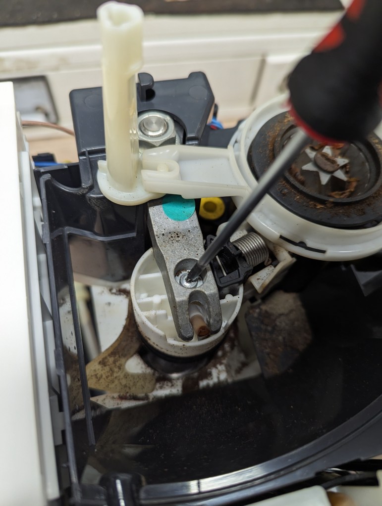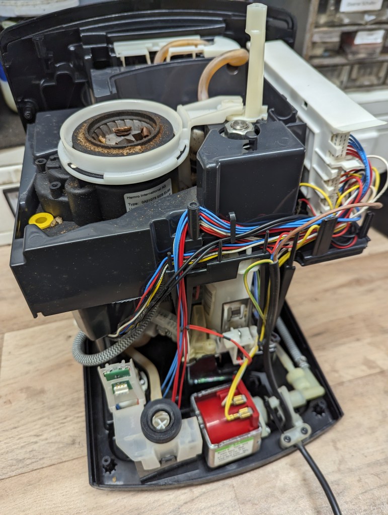 Wie man hier leider ein wenig schlecht erkennen kann, wurde die Pumpe nur mit Kabelbinder befestigt. Ist nicht tragisch, aber ein wenig filigran. Pumpe tauschen- OK! Elektronik auf der Seite tauschen -OK! Das wars aber dann. Boiler ist ein komplettes System mit der Brüheinheit. Hier muß man tatsächlich die komplette Maschine zerlegen und wieder zusammenbauen. Ersatzteil kostet ca. € 120,- doch der Arbeitsaufwand ist irre!