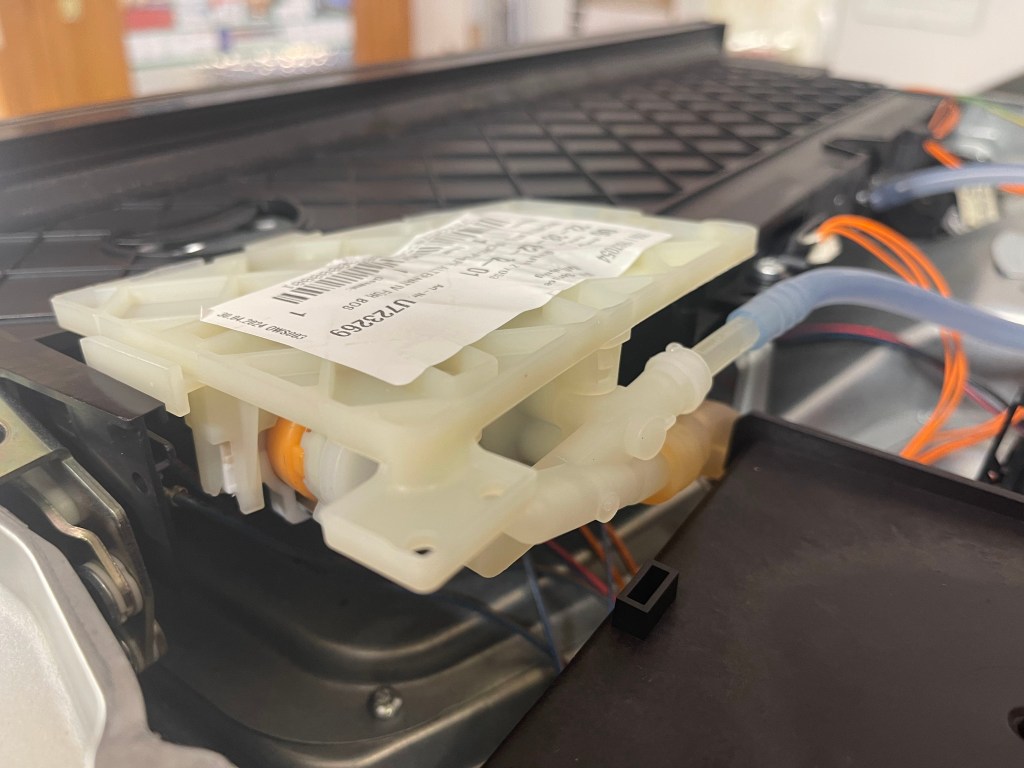 Die Pumpe ist gesteckt und nicht verschraubt. Vorsichtig mit einem Schlitzschraubendreher die Verankerung lösen und nach hinten schieben. Die Wasserschläuche abziehen, bitte unbedingt die Steckfolge merken damit nach dem tausch alles seine Ordnung hat. Wenn aus der Verankerung dann den einen Kabelverbinder vorsichtig lösen. Bitte nicht an den Kabeln ziehen, sind sehr dünn und könnten „brechen“.